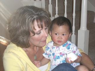 Olivia is 13 months old today. We have had her in our life for 6 1/2 weeks. and have been home for 4 1/2 weeks. I can't believe how much our lives have changed. I can sit on the floor and play with Olivia for hours. She is such a sweetie, if I do say so myself. She loves stuffed toys, as you can see in the picture above with Piglet & Eeyore. She hugs and kisses her soft animals. I doubt while she was in China she had a stuffed animal. We took all of this for granted with Megan, but with Olivia we realized how little all of the orphans have. Bob & I feel so blessed to have Olivia in our lives, she brings such joy to each day.